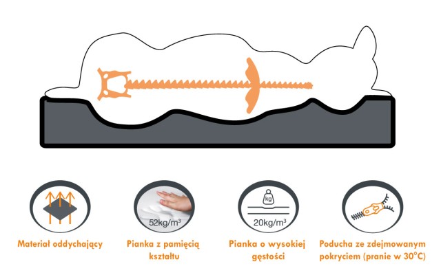 ➜ Zalety : możliwość pełnej adaptacji produktu do unikalnego kształtu ciała zwierzęcia sprawia, że MEMORY zapewnia psu najwyższy komfort i przyczynia się do łagodzenia dolegliwości kostno-stawowych.