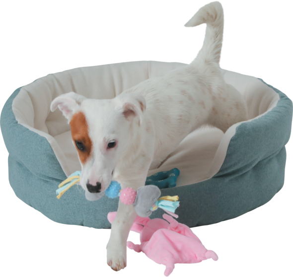 Aby stworzyć dla niego bezpieczną i spokojną przestrzeń, możesz wybrać poduchy lub legowiska z gamy PUPPY, dostępne w dwóch rozmiarach, lub uroczy namiot tipi z poduszką w komplecie.