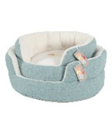 Legowisko "Dream" powstało z połączenia dwóch materiałów: niebieskiej tkaniny o splocie przypominającym wełnę i beżowego polaru. Poduszka pokryta jest miękkim, zdejmowanym pokrowcem z polaru, co ułatwia utrzymanie jej w czystości.
