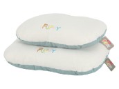 Poduszka dla szczeniąt ze zdejmowanym pokrowcem powstała z połączenia dwóch materiałów: niebieskiej tkaniny o splocie przypominającym wełnę i beżowego polaru. Każda poduszka zdobiona jest również wielobarwnym haftem «Puppy».