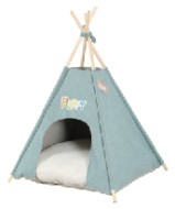 Namiot Tipi, wykonany z niebieskiej tkaniny o splocie przypominającym wełnę, wraz ze znajdującą się w środku poduszką z beżowego polaru (ze zdejmowanym pokrowcem), to idealny sposób na stworzenie niewielkiej przestrzeni spokoju dla szczeniaka.