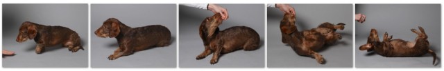 - Wyjmij smakołyk, przytrzymaj go nad psim uchem, podnieś i powoli przenieś wokół jego głowy, jednocześnie mówiąc: „Turlaj się!”. Wodząc pyskiem za nagrodą, pies straci równowagę i zacznie się turlać.